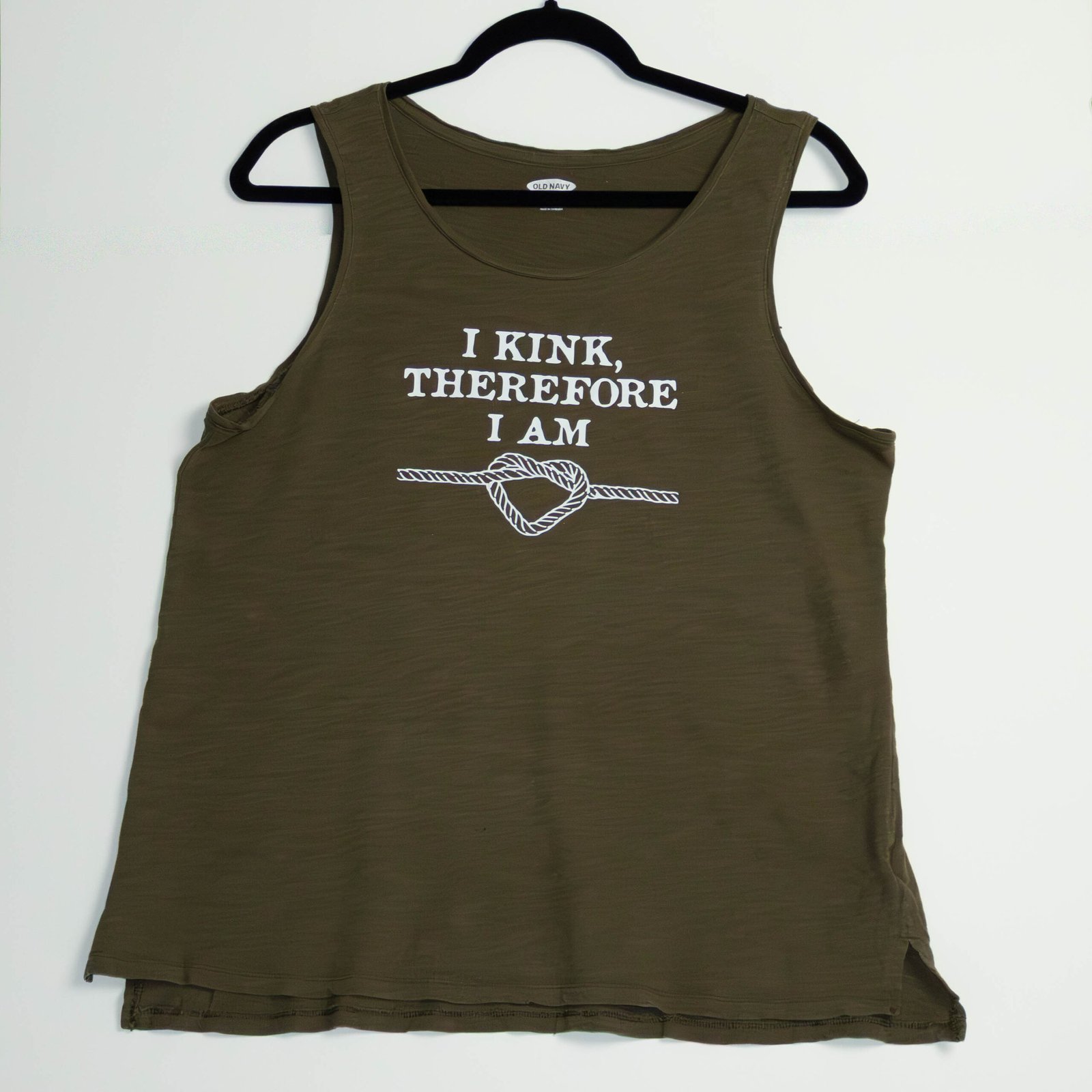 Large dark green tank with white writing “I KINK, THEREFORE I AM” and rope. 100% Cotton