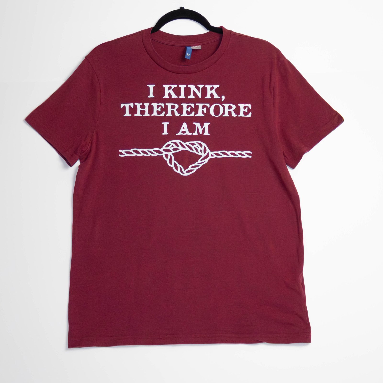Medium Red t-shirt with white text “I KINK, THEREFORE I AM” and rope. 60% Cotton